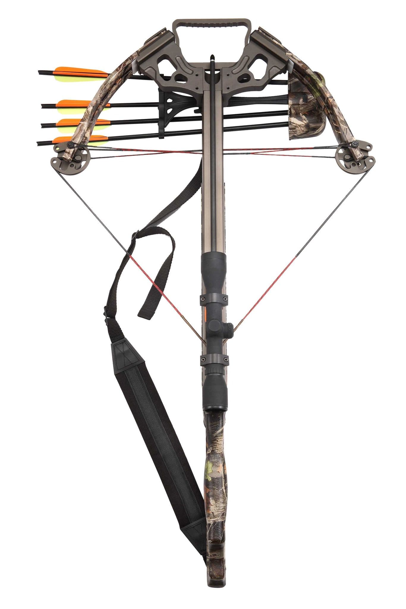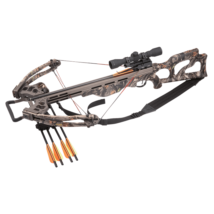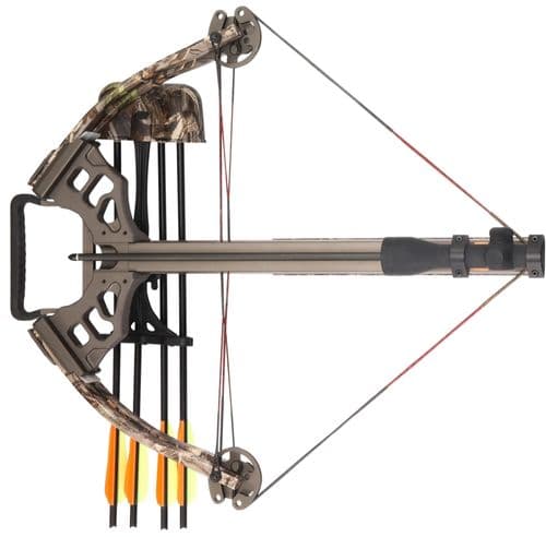 Мощный, тихий и компактный арбалет с камуфляжной расцветкой, идеальный для спортивной стрельбы.