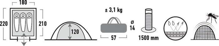 Материал внешнего тента: Полиэстер с PU-покрытием, водонепроницаемость 1500 мм, герметизированные швы