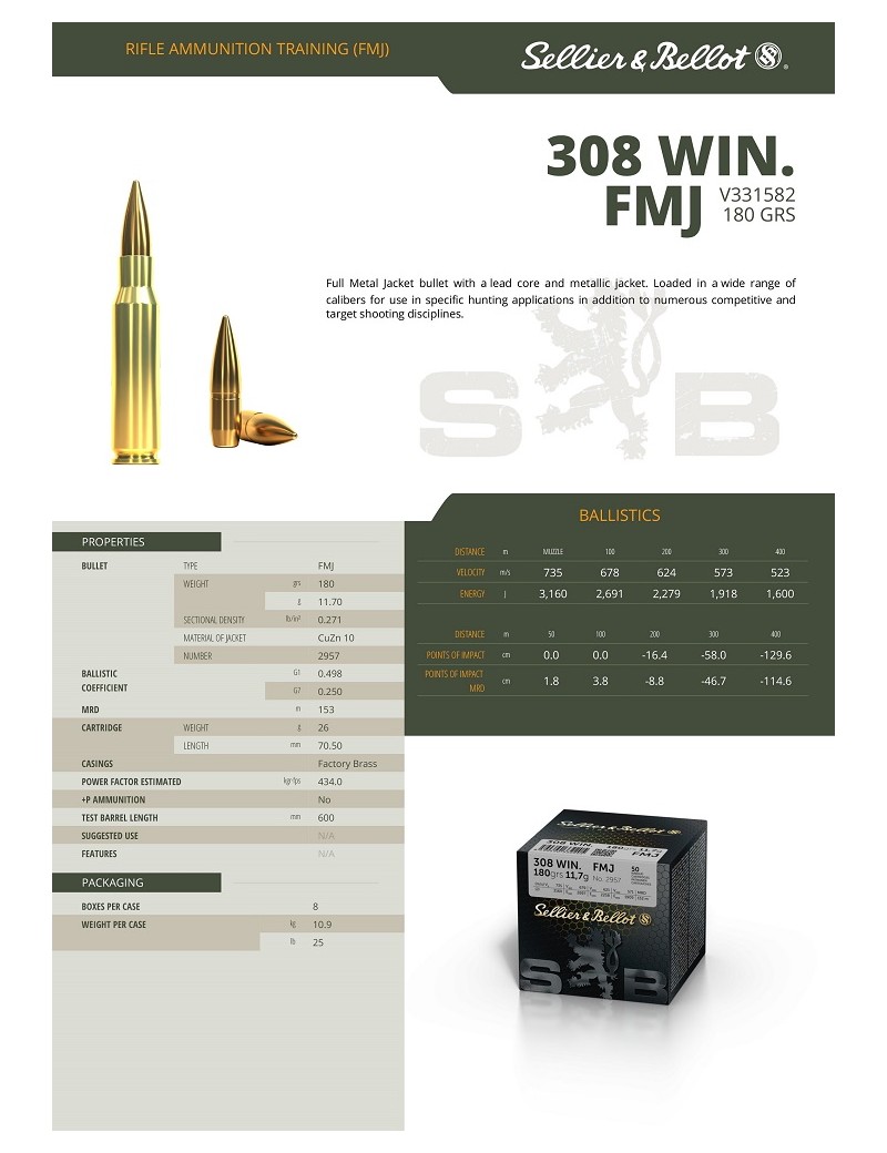 Патрон для нарезного оружия S&B (.308 Win.) (FMJ-2957)(180grs)(11,7г)