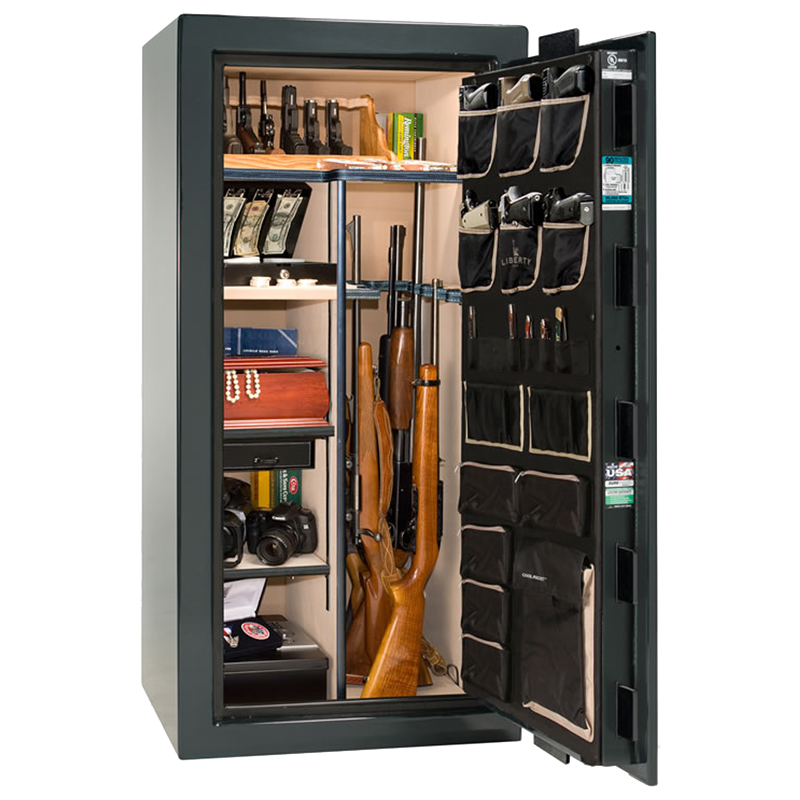 Сейф Liberty Lincoln 25 в темно-зеленом глянцевом цвете с фурнитурой Brass — премиальный сейф для хранения оружия и ценностей. Эта модель идеальна для владельцев среднего арсенала, которым важны надежность и стиль.